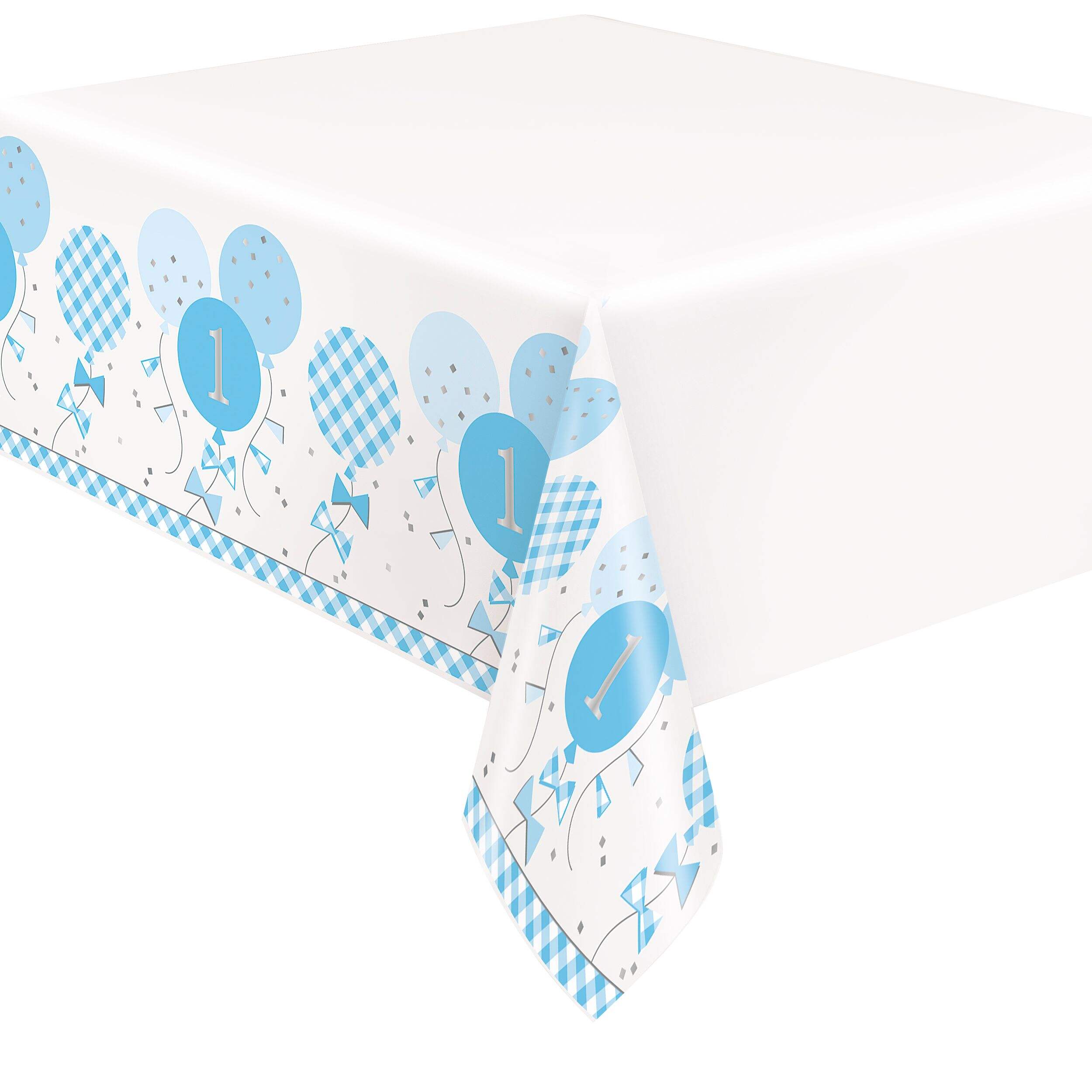 Featuring a blue plaid pattern, balloon designs, and gold accents, this 84 by 54-inch plastic table cover will add just the right touch to your 1st birthday bash