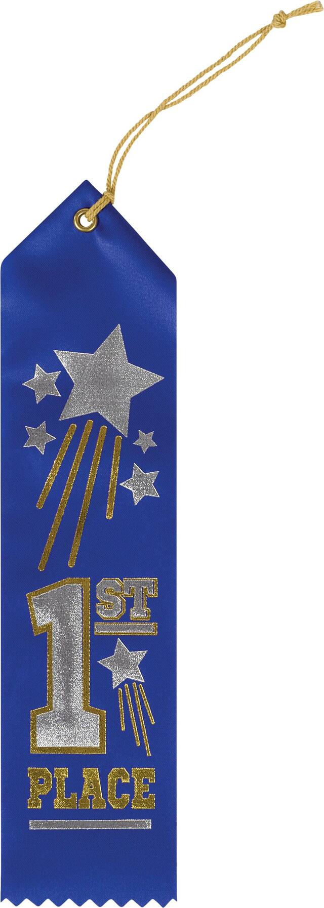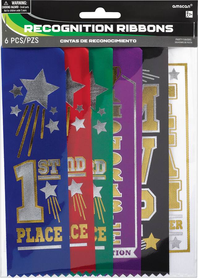 Pack includes six assorted coloured ribbons with different headlines including "1st Place", "2nd Place", "3rd Place", "Honorable Mention", "MVP", and "Team Player"