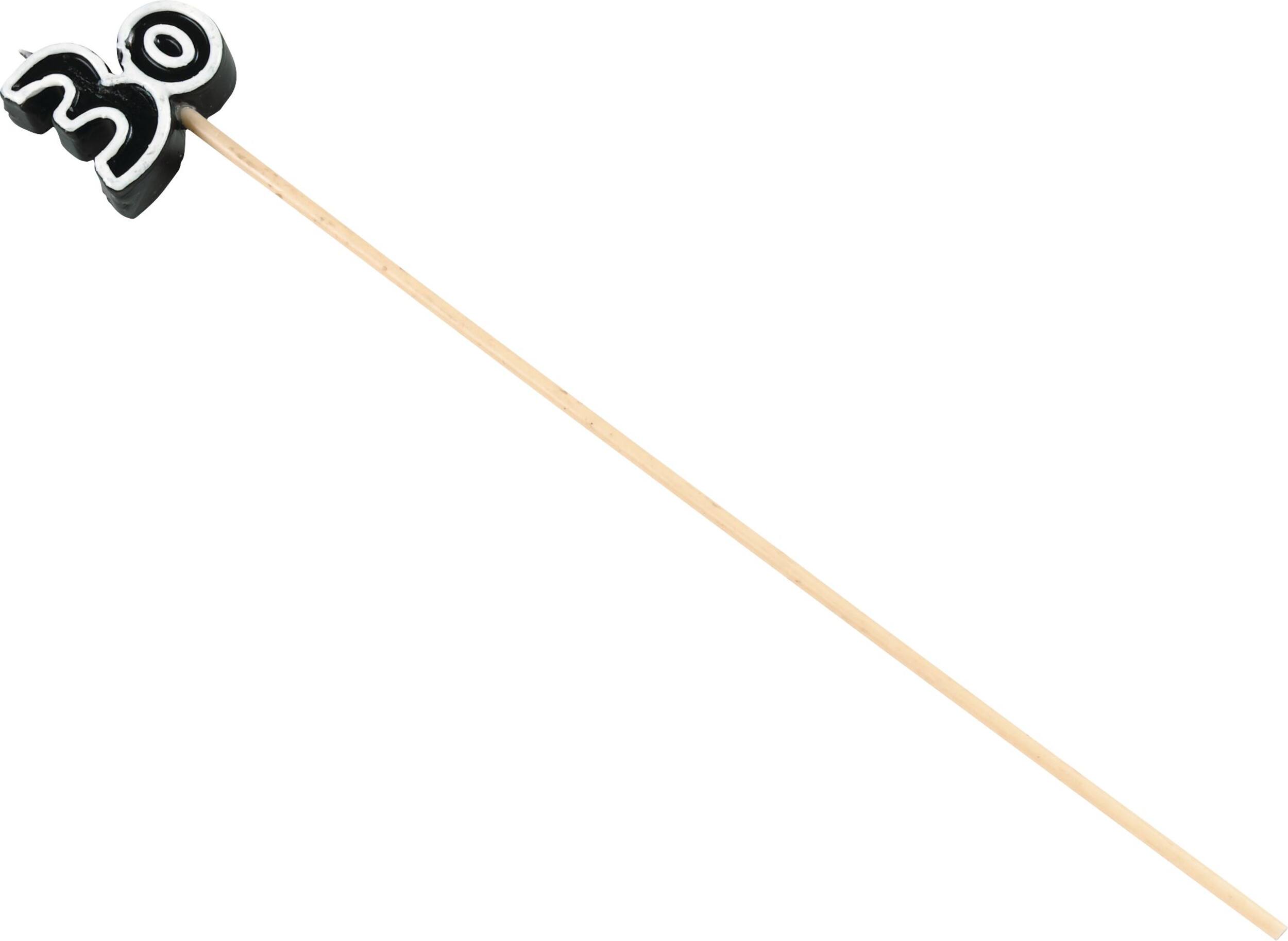 Each tall toothpick candle features a black and white number 30 candle attached to a sturdy plastic pick base