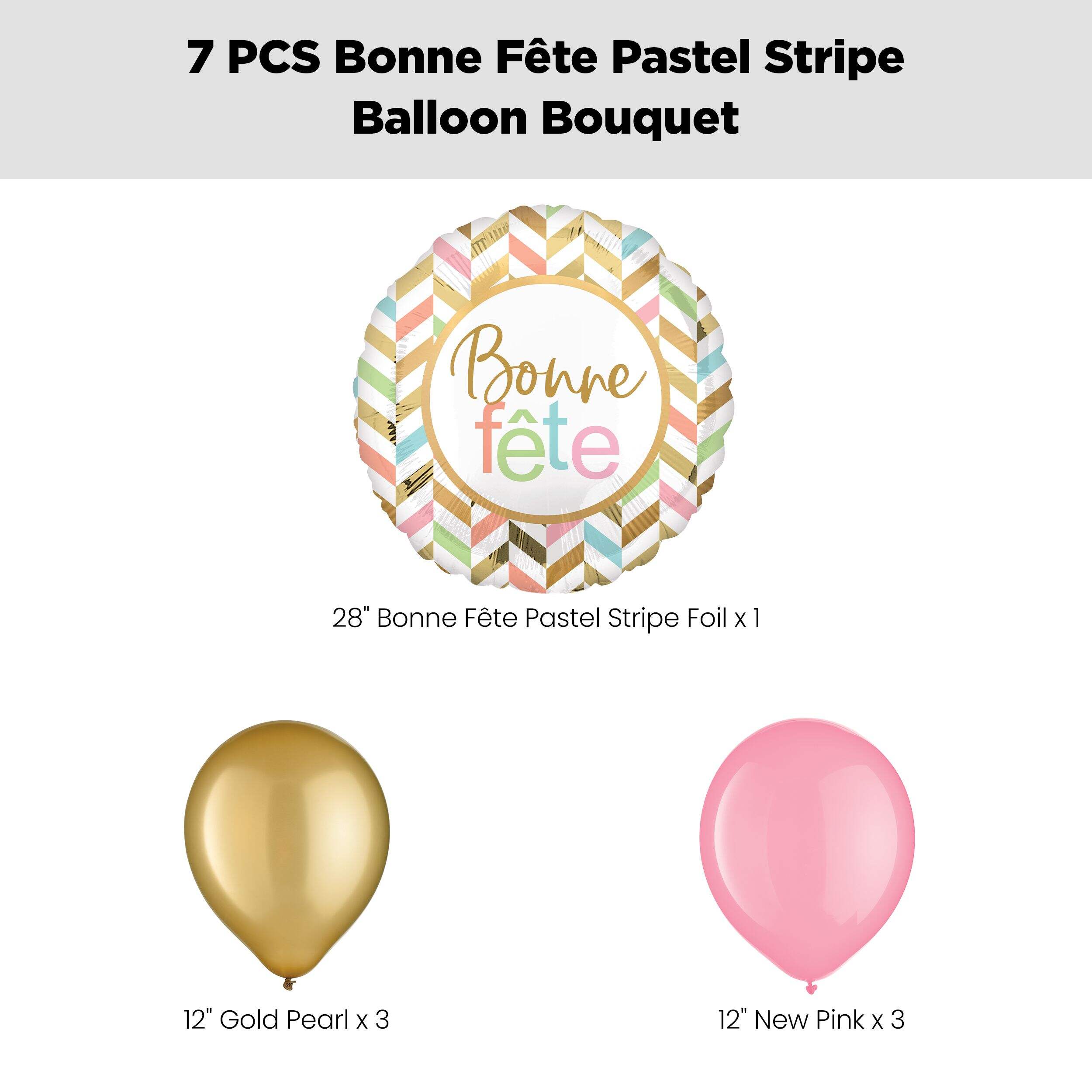 Sign up to receive a notification when this product is back in stock.Celebrate a special birthday in style with this “Bonne Fête” French Happy Birthday Pastel Stripe Jumbo Balloon Bouquet. Featuring a 28” balloon along with a cluster of new pink and gold 12” latex balloons, this 7-piece bouquet adds instant excitement to any space.