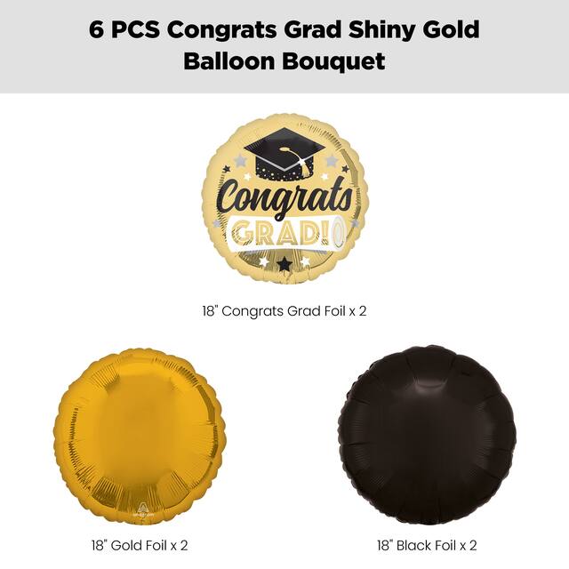 This kit includes: 2 "Congrats Grad!" Shiny Gold 18" Balloon (SKU 8443048), 2 18" Gold Round Foil Balloons (SKU 8423908) and 2 18" Black Round Foil Balloons (SKU 8423874)