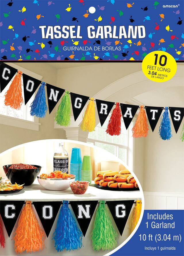 You may be interested in these similar products shown below.Multicolour Graduation Tassel Garland features alternating vibrantly coloured tissue paper tassels and black cardstock pennants with white lettering this garland reads "Congrats"