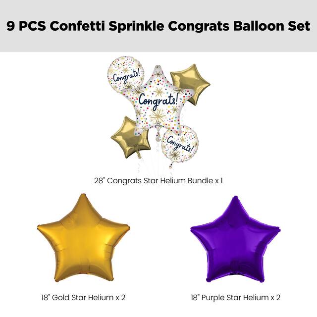 This kit includes: 1 28" "Congrats" Star Confetti Sprinkle Polka Dot Satin Foil Balloon, 2 Sprinkle "Congrats" 18" Round Balloons, 2 18" Gold Star Foil Balloons (SKU 8551628), 2 18" Purple Star Foil Balloons and 2 18" Gold Star Foil Balloons