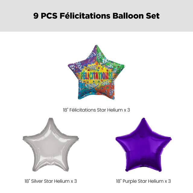 This kit includes: 3 18" "Félicitations" French Star Satin Foil Balloon (SKU 8551667), 3 18" Silver Star Foil Balloons (SKU 8423944) and 3 18" Purple Star Foil Balloons (SKU 8423949)