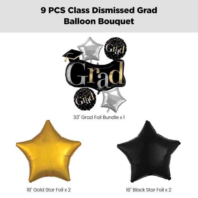 This kit includes: 1 "Grad" Class Dismissed 30" Supershape Balloon (SKU 8551533), 2 matching 18" balloons, and 2 18" Silver Star Balloons, 2 18" Black Star Foil Balloons (SKU 8423875) and 2 18" Gold Star Foil Balloons (SKU 8423946)