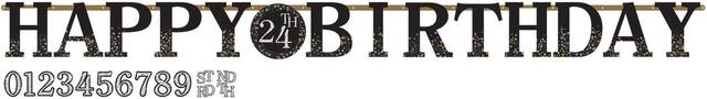 You may be interested in these similar products shown below.The Customizable Happy Birthday Banner Kit in black is a sparkling celebration paper banner that adds a dazzling touch to any birthday celebration. Its bubbly design in black, gold, and silver features a "Happy Birthday" headline. The kit includes stickers, allowing you to personalize the banner with the age of the celebrant. Its reusability means you can celebrate numerous birthdays with it. The banner, measuring 65" x 20", comes with grommets for hanging, making it suitable for both indoor and outdoor placement. The kit also includes 24 number and letter stickers for a custom surprise.