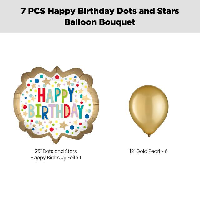 Celebrate a special birthday in style with this "Happy Birthday" Dots and Stars Supershape Balloon Bouquet. Featuring a 25" balloon along with a cluster of gold 12" latex balloons, this 7-piece bouquet adds instant excitement to any space.