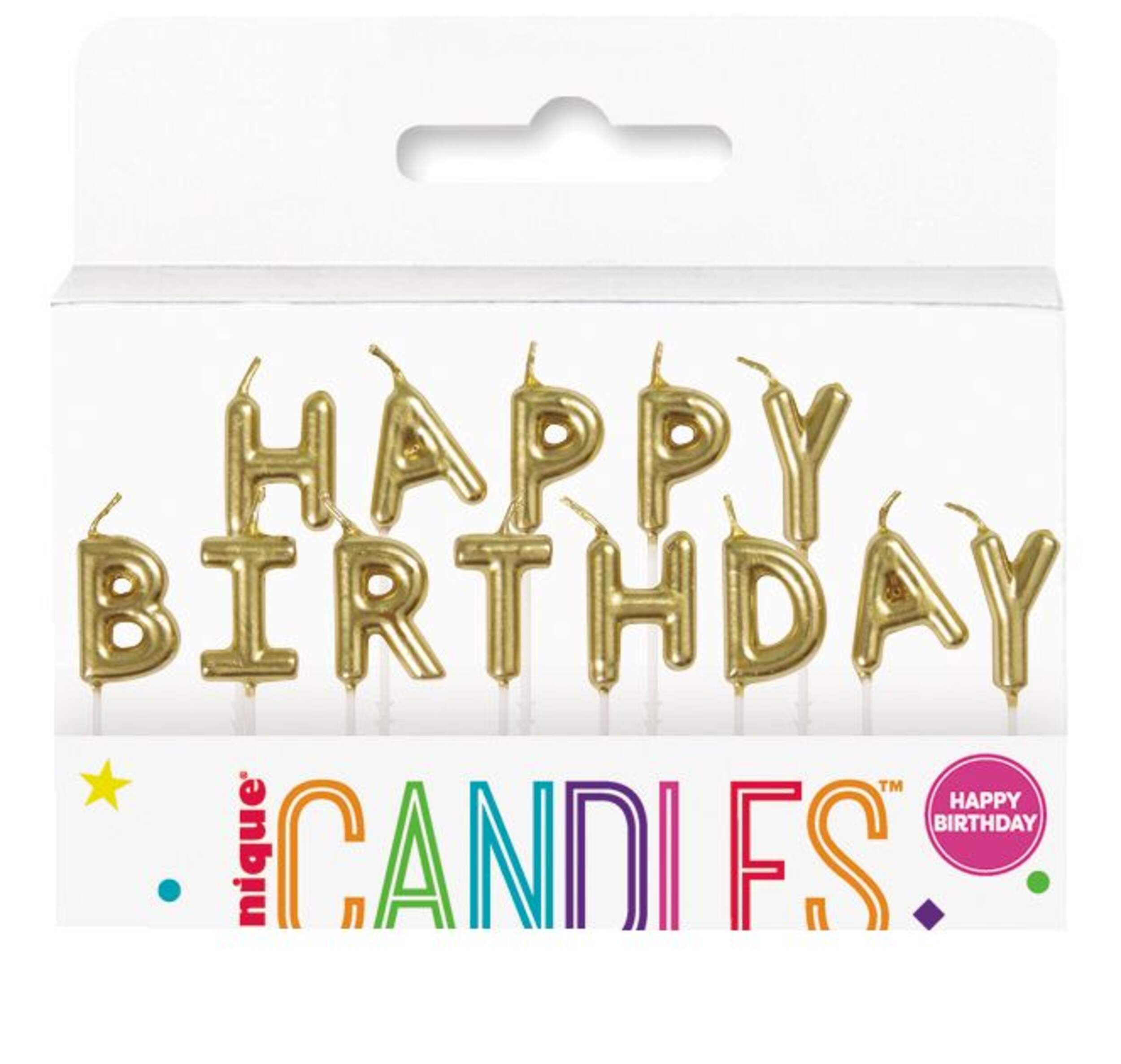 Gold "Happy Birthday" Letter Candle Set that feature a headline "Happy Birthday" in balloon shaped candles
