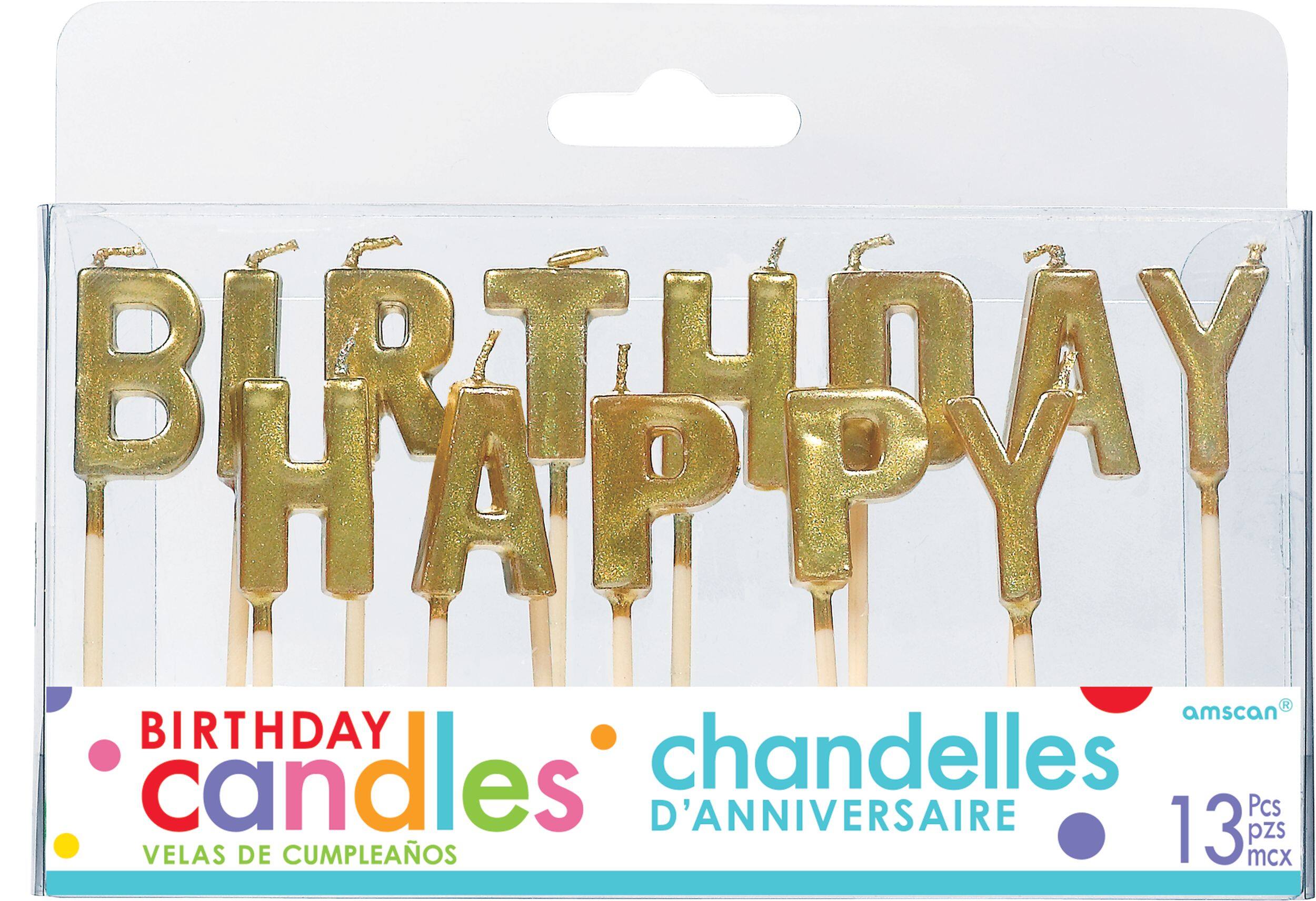 Fabulous letter candles spell out "Happy Birthday" in elegant gold