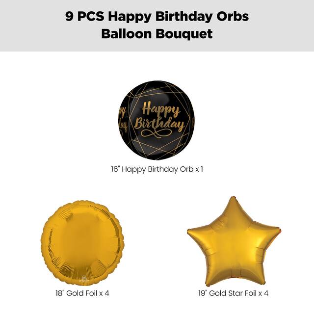 This kit includes: 1 16" "Happy Birthday" Orbz Balloon (SKU 8547855), 4 18" Gold Round Foil Balloons (SKU 8423908) and 4 18" Gold Star Foil Balloons (SKU 8423946)