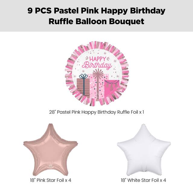 This kit includes: 1 28" “Happy Birthday” Pastel Pink Ruffle Jumbo Balloon (SKU 8551388), 4 18" Pastel Pink Star Foil Balloons (SKU 8423880) and 4 18" White Star Foil Balloons (SKU 8423948)