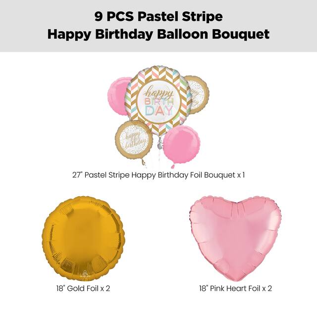 This kit includes: 1 27" "Happy Birthday" Jumbo Balloon Bouquet, 2 18" "Happy Birthday" Balloons, 2 18" Pink Round Balloons (SKU 8424562), 2 18" Gold Round Foil Balloons (SKU 8423908) and 2 18" Pastel Pink Heart Foil Balloons (SKU 8424235)