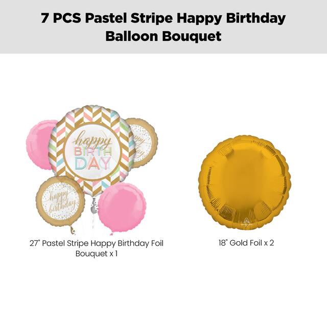 This kit includes: 1 27" "Happy Birthday" Pastel Stripe Jumbo Balloon Bouquet, 2 18" "Happy Birthday" Balloons, 2 18" Pink Round Balloons (SKU 8424562) and 2 18" Gold Round Foil Balloons (SKU 8423908)