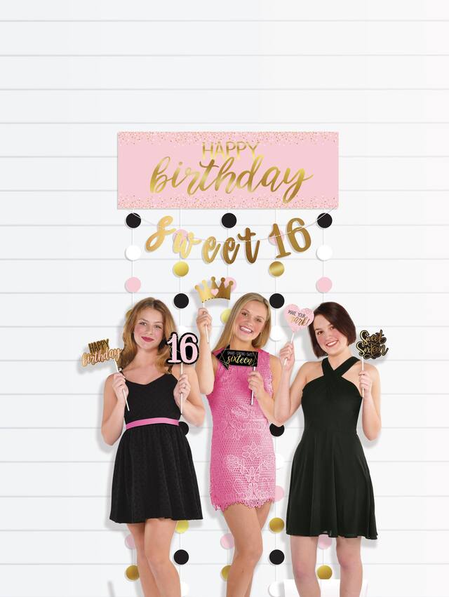 You may be interested in these similar products shown below.This sweet 16 photo booth kit has everything needed to capture precious moments from the birthday bash. The backdrop reads “Happy Birthday Sweet 16†with circle cutouts, while gold, pink and black photo props like tiaras, glasses and lips add fun for selfies. Guests will enjoy snapping photos with the metallic gold and pink props to commemorate this milestone birthday.