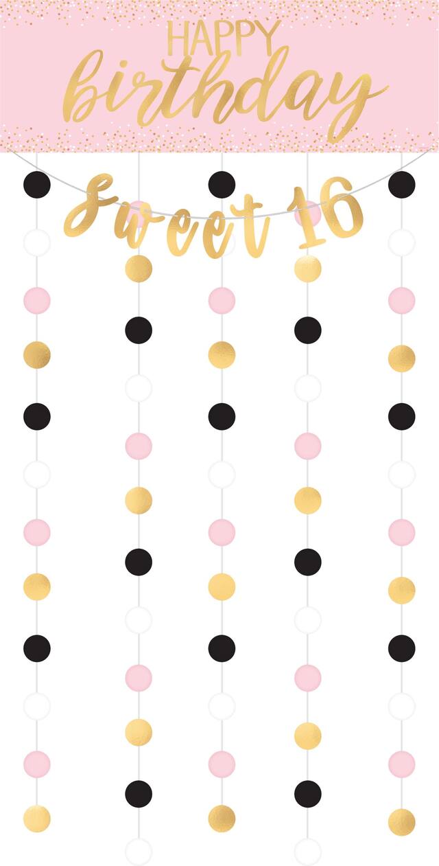 Features backdrop set with "Happy Birthday" and "Sweet 16" and also includes circular cutouts hanging from the bottom