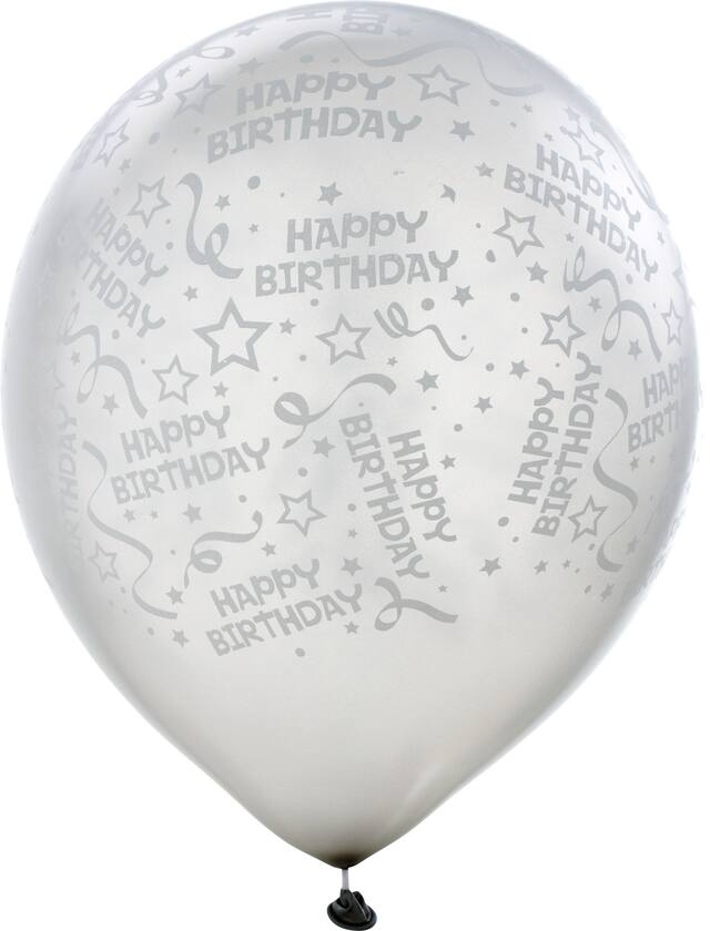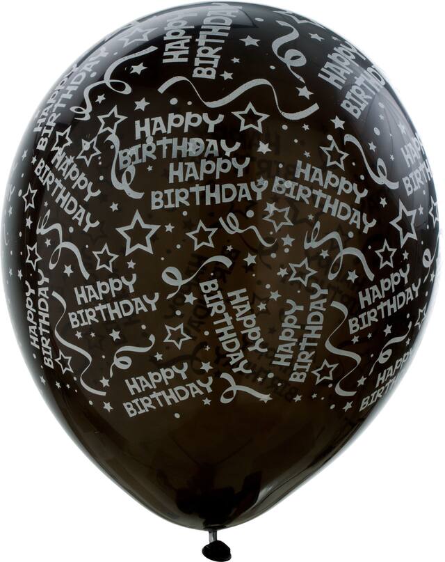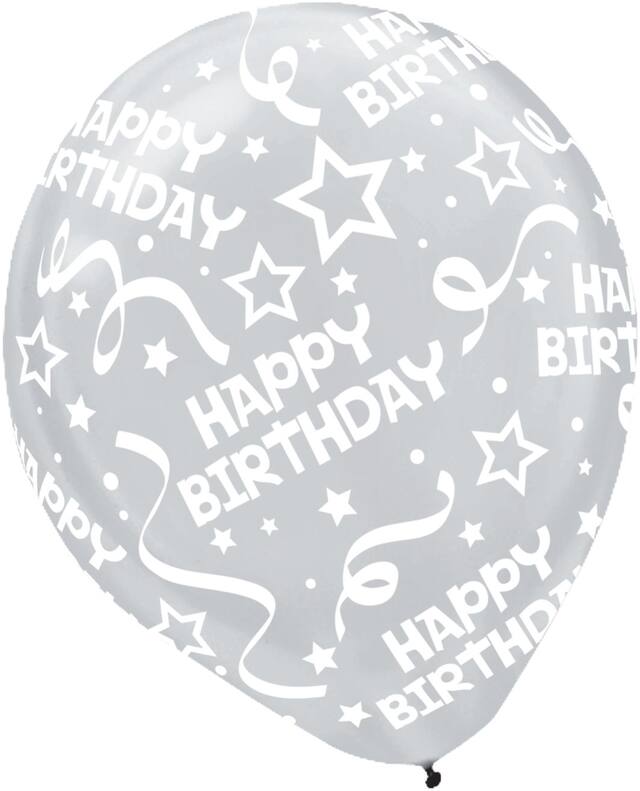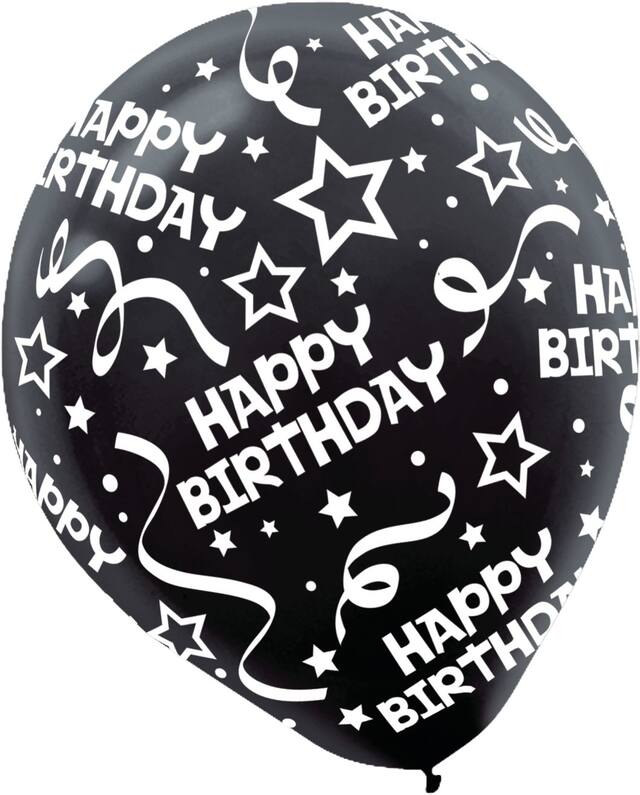 Metallic Confetti Birthday Balloons features all-over white stars, confetti, and "Happy Birthday" prints over black, pearlized silver, and gold