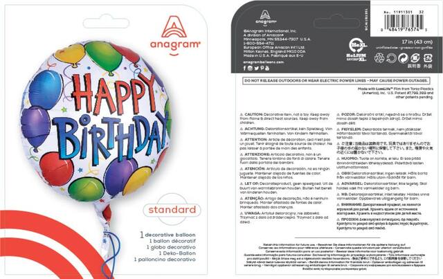 Fun Happy Birthday Balloon, 17-in by Anagram Int'l Inc. is the perfect addition to any birthday celebration. The white balloon features a border of colorful balloons and a cheery "Happy Birthday" headline that is sure to bring a smile to the birthday boy or girl. At 17 inches, this balloon is large enough to be seen from across the room and will help set a festive mood for the party. Add some matching balloons and you'll have created a fun balloon bouquet in minutes to help your celebrant kick off their special day in style.