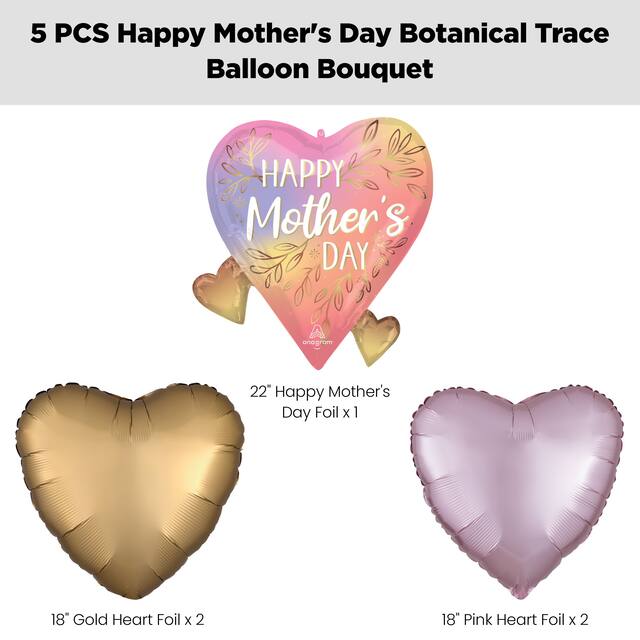 This kit includes: 1 "Happy Mother's Day" Botanical Trace 22" Heart Supershape Balloon (SKU 8551525), 2 18" Gold Heart Foil Balloons (SKU 8424099) and 2 18" Pastel Pink Heart Foil Balloons (SKU 8432854)