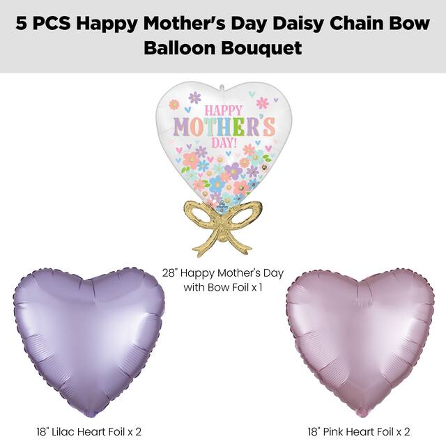 Elevate your Mother's Day decorations with this "Happy Mother's Day" Daisy Chain Bow 28" Supershape Balloon Bouquet with Pink and Lilac 18" Heart Foil Balloons