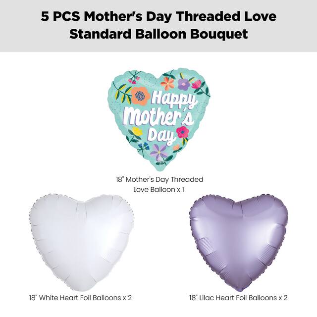 Sign up to receive a notification when this product is back in stock.Mom deserves a gift as thoughtful and radiant as she is, and this “Happy Mother’s Day” Threaded Love Balloon Bouquet delivers. The 5-piece set features a beautiful 18” design with white and lilac 18” heart foil balloons that are sure to make her smile.