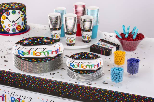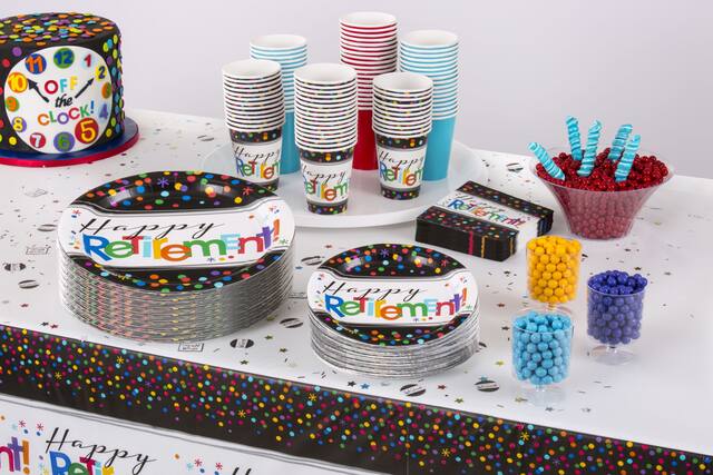 Happy Retirement Celebration Dinner Plates feature a "Happy Retirement!" message