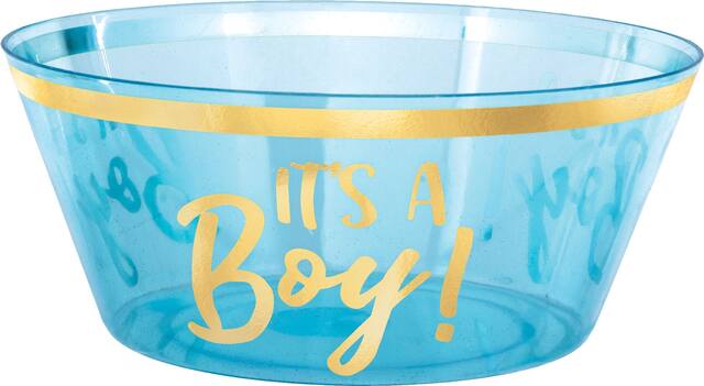 Blue plastic serving bowl features It's A Boy! text in metallic gold script and has a metallic gold trim around the bowl