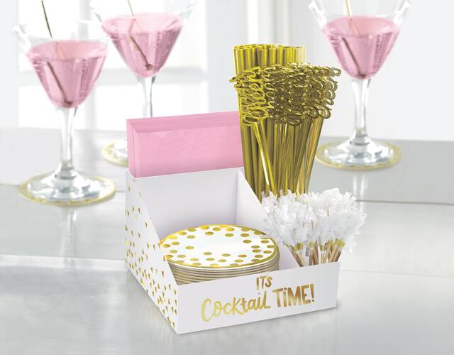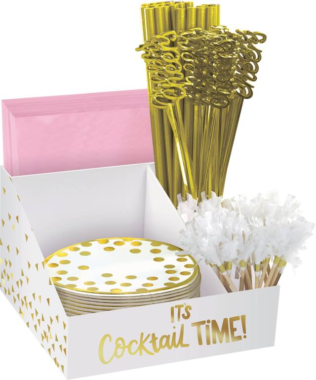 Cardstock caddy is white with a metallic gold triangle pattern and a metallic gold "It's Cocktail Time!" headline printed on the front