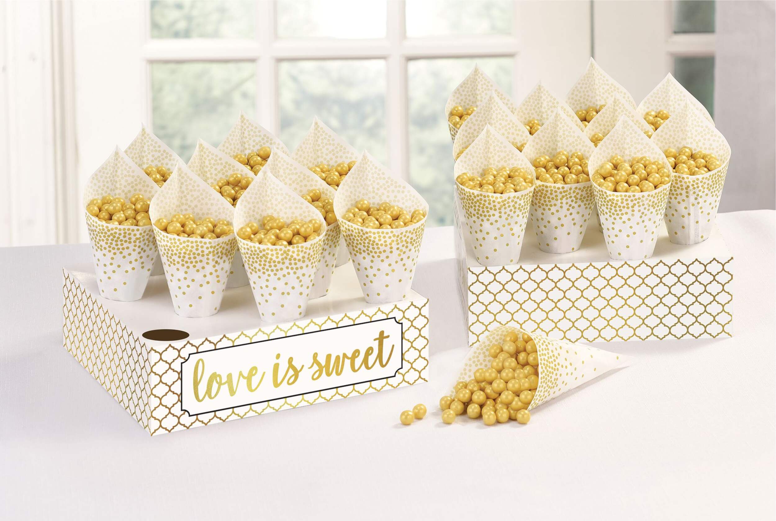 You may be interested in these similar products shown below.Love Is Sweet Snack Cones Kit features a gold dot pattern against a white background