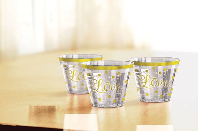 Add a touch of elegance to your special occasion with these 'Love' Plastic Reusable Tumbler Cups. Perfect for weddings, engagements, and bridal showers, these clear plastic cups with gold polka dots bring a sophisticated charm to any celebration. Enjoy the convenience of disposable wedding cups without sacrificing style.