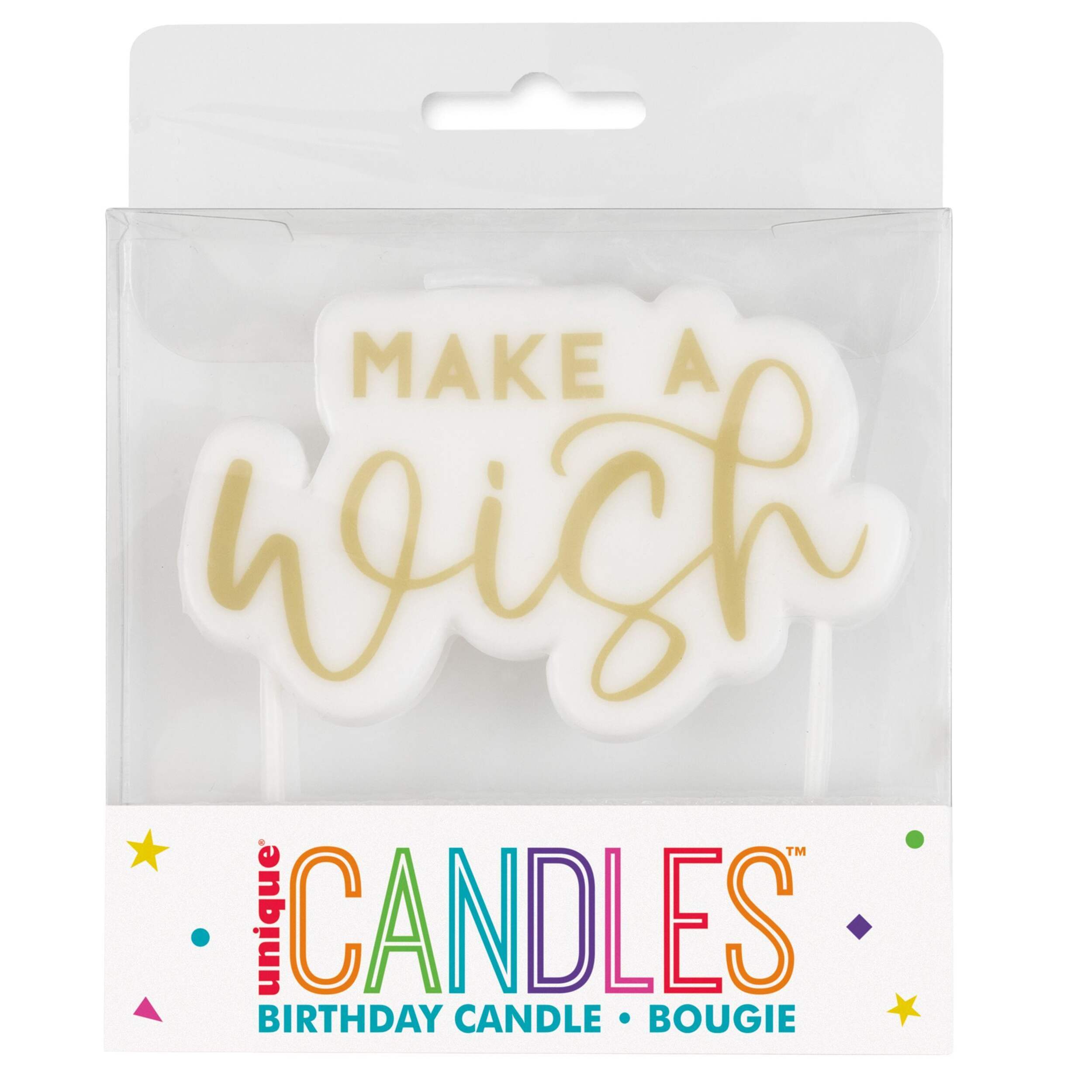 Large white candle reads "Make a Wish" in eye-catching gold glitter
