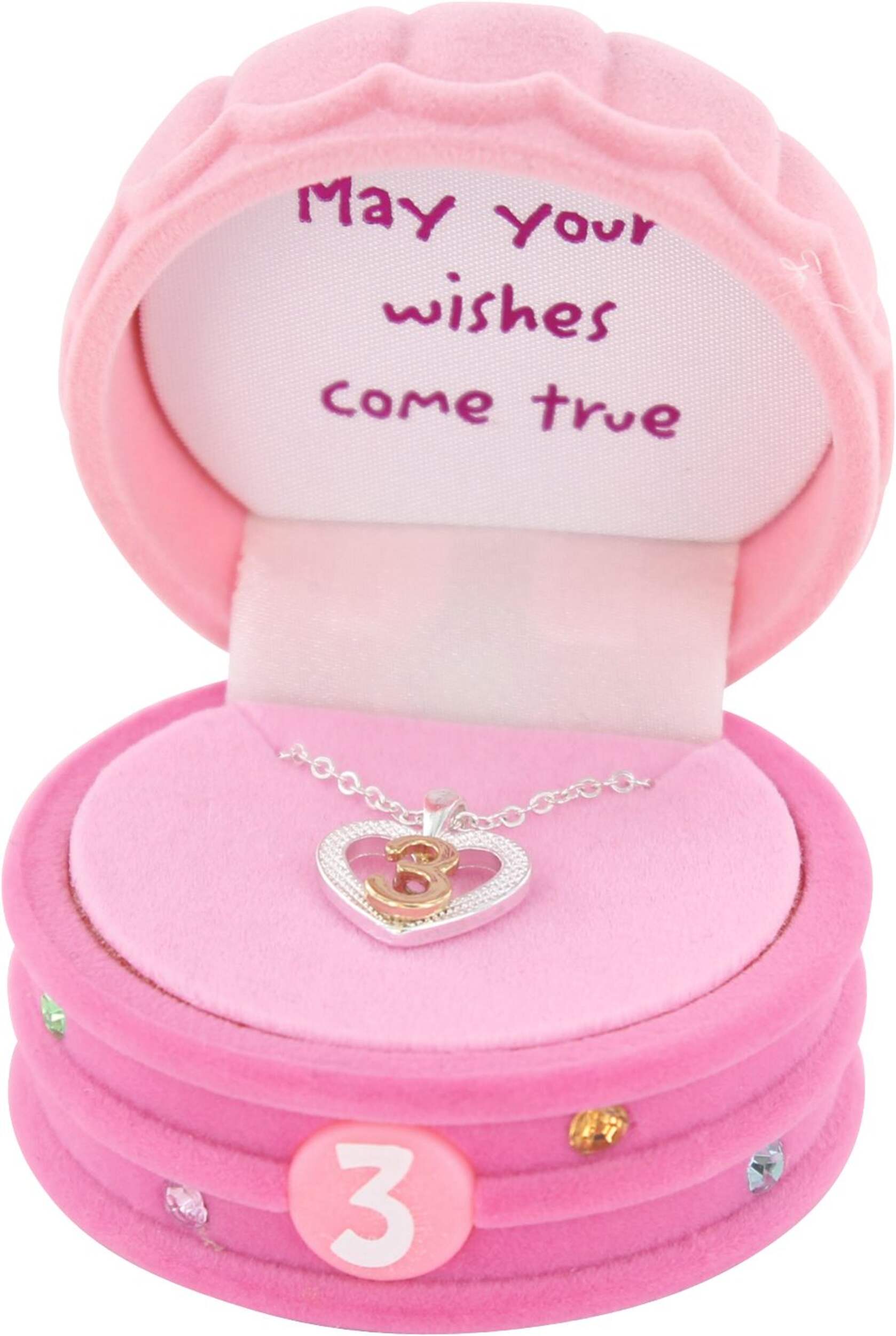 Celebrate for 365 days! Be proud to wear your number at any age from 3 through 8. An adorable gold-plated number with stippled silvertone heart pendant on 16-inch cable chain, plus 2-inch extender. Flocked keepsake birthday box with colored accents and inner lid sentiment–"May Your Wishes Come True" takes the cake!
