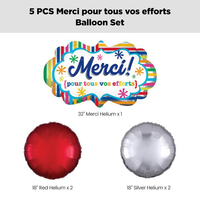 This kit includes: 1 32" "Merci pour tous vos efforts" French Round Satin Foil Supershape Balloon (SKU 8546019), 2 18" Silver Round Foil Balloons (SKU 8423906) and 2 18" Red Round Foil Balloons (SKU 8423907)