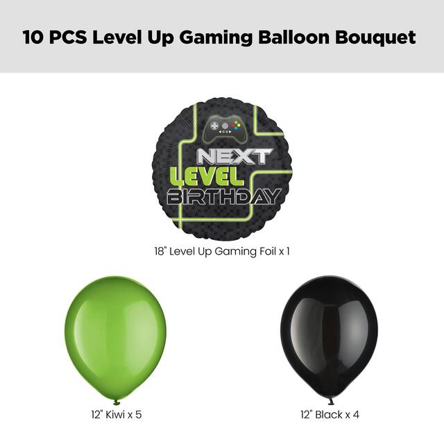 Time to level up and celebrate your little gamer's birthday with a video game-themed “Next Level Birthday" Level Up Gaming 18" Balloon Bouquet with Black and Kiwi 12" Latex Balloons