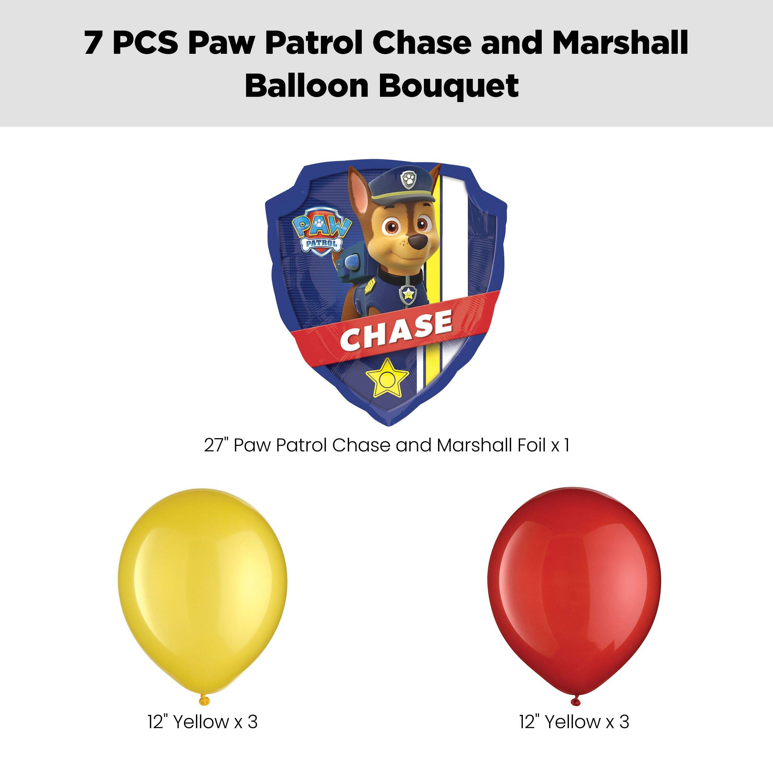 This kit includes: 1 27" "PAW Patrol Marshall" Supershape Balloon (SKU 8424386), 3 12" Yellow Round Latex Balloons (SKU 8421407) and 3 12" Red Round Latex Balloons (SKU 8421414)