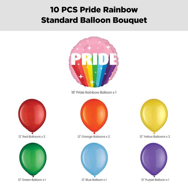 Sign up to receive a notification when this product is back in stock.Bring a vibrant burst of joy with this "Pride" Rainbow Balloon Bouquet. Featuring an 18" balloon with rainbow-hued latex balloons, this 10-piece bouquet is sure to add cheer to your Pride celebrations.