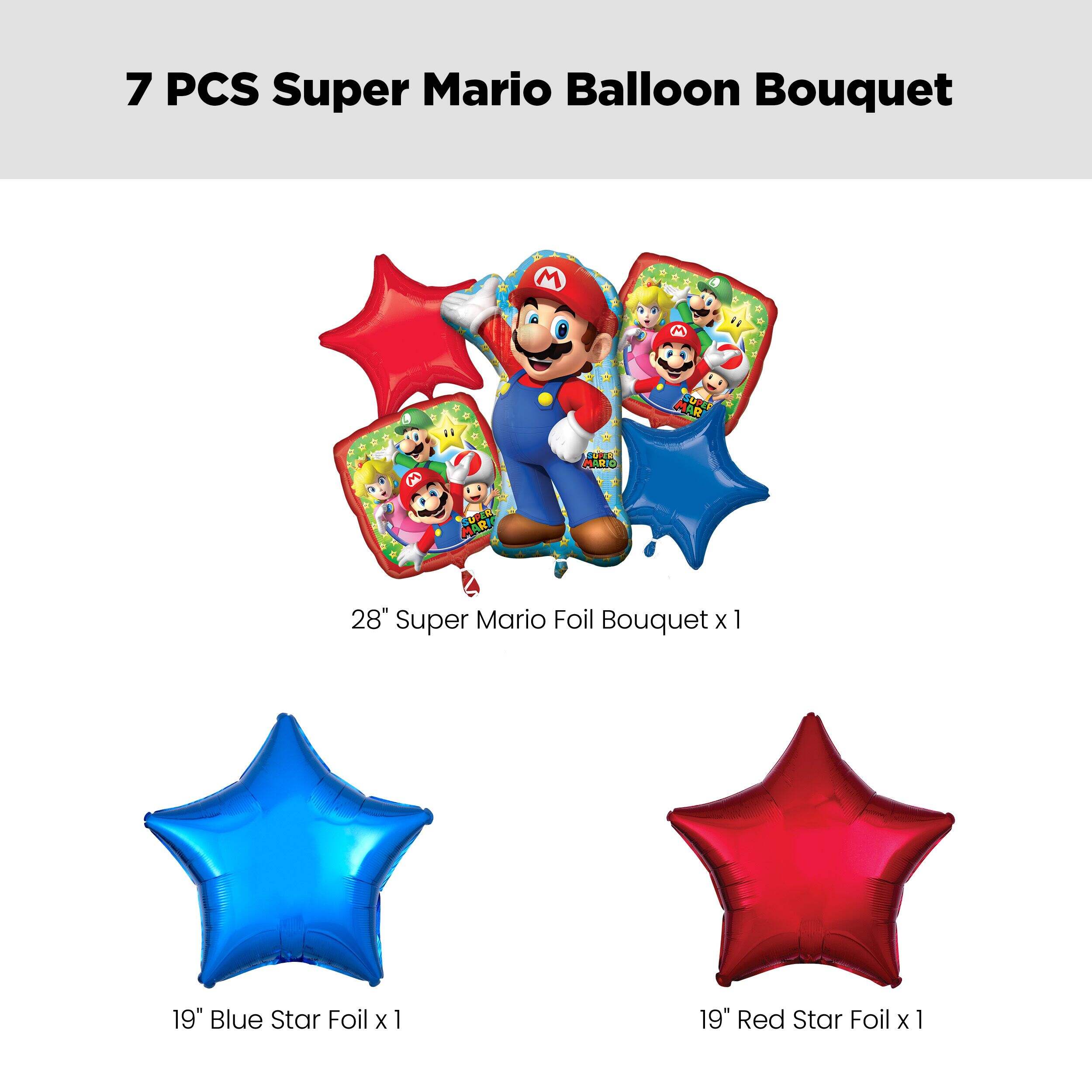 • This kit includes: 1 28" "Super Mario" Jumbo Balloon Bouquet, 2 18" Square Balloons, 2 18" Red and Blue Star Foil Balloons (SKU 8424571), 1 18" Blue Star Foil Balloon (SKU 8423947) and 1 18" Red Star Foil Balloon (SKU 8423945)