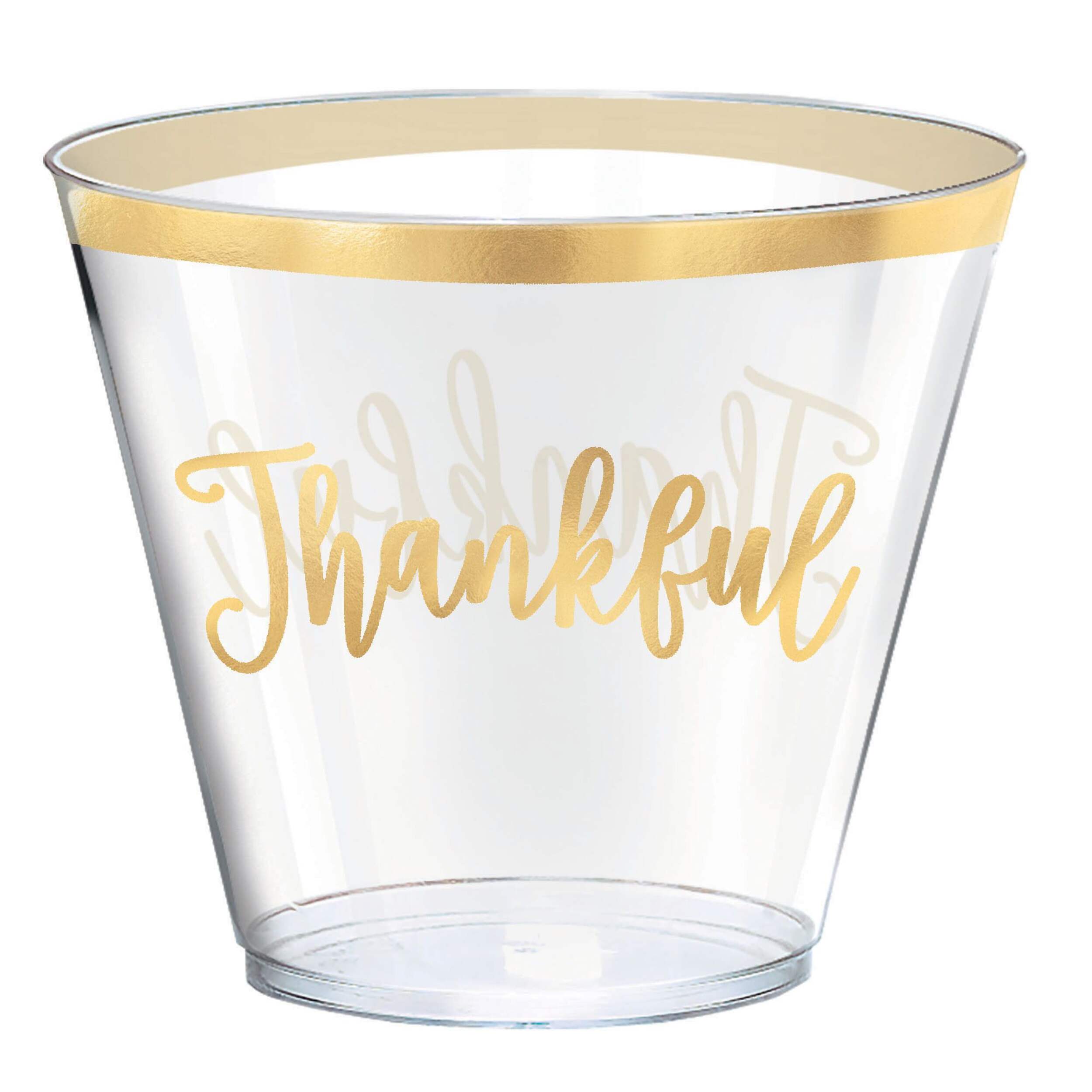 Small clear plastic cups feature metallic gold trim at the top and a metallic gold "Thankful" headline
