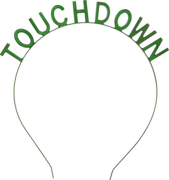 Metal headband is bright green and features letter attachments that read "Touchdown"