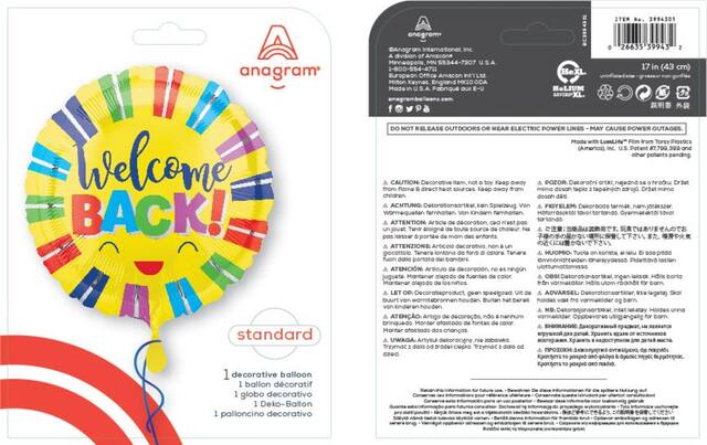 This cheerful yellow foil balloon is shaped like a smiling sun and features a colorful "Welcome Back!" headline, perfect for brightening up a back-to-school or welcome home party. At 17 inches wide, this self-sealing reusable balloon will bring a smile to their face as they return from time away. Help liven up their day with this bright balloon that shows them life's a little brighter when they're around.