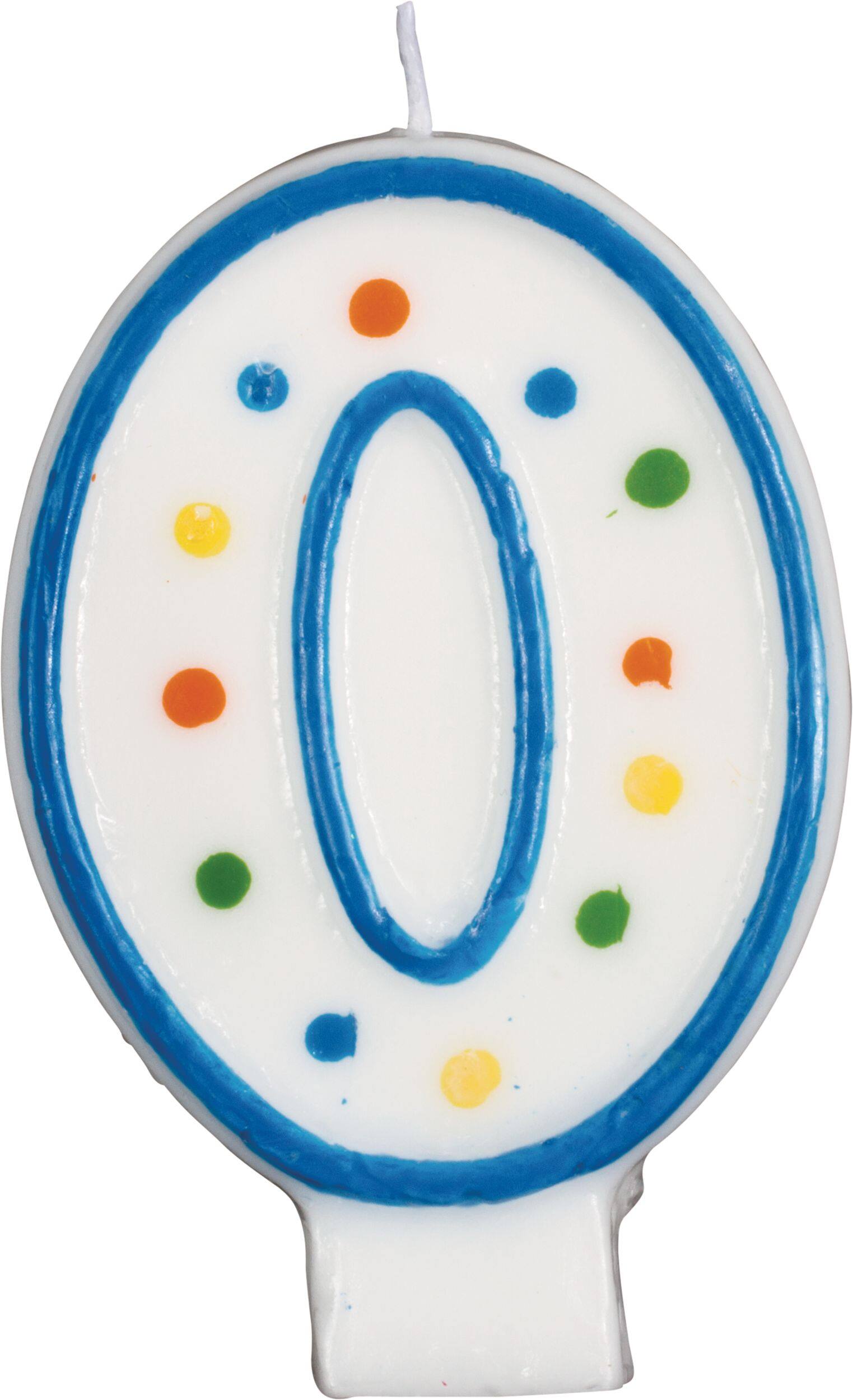Molded birthday candle is shaped like a number and has a coloured outline and colorful polka dots