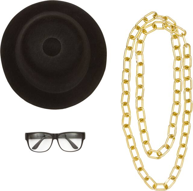 The Old School Rapper Accessory Kit features a large gold chain necklace, large black-rimmed glasses, and a stiff black hat