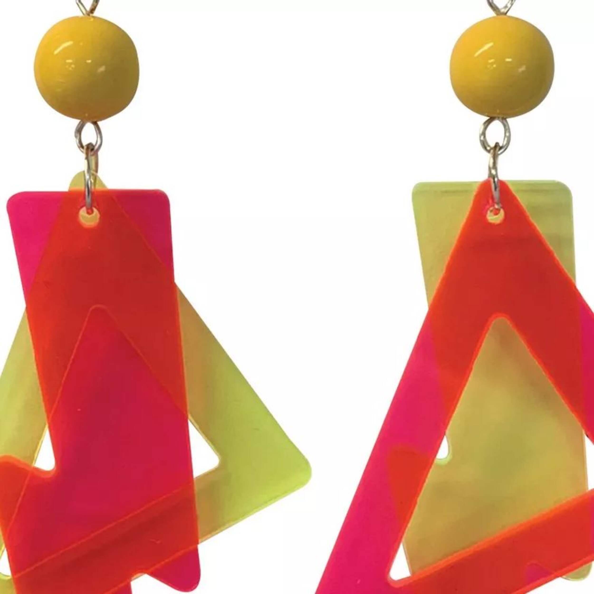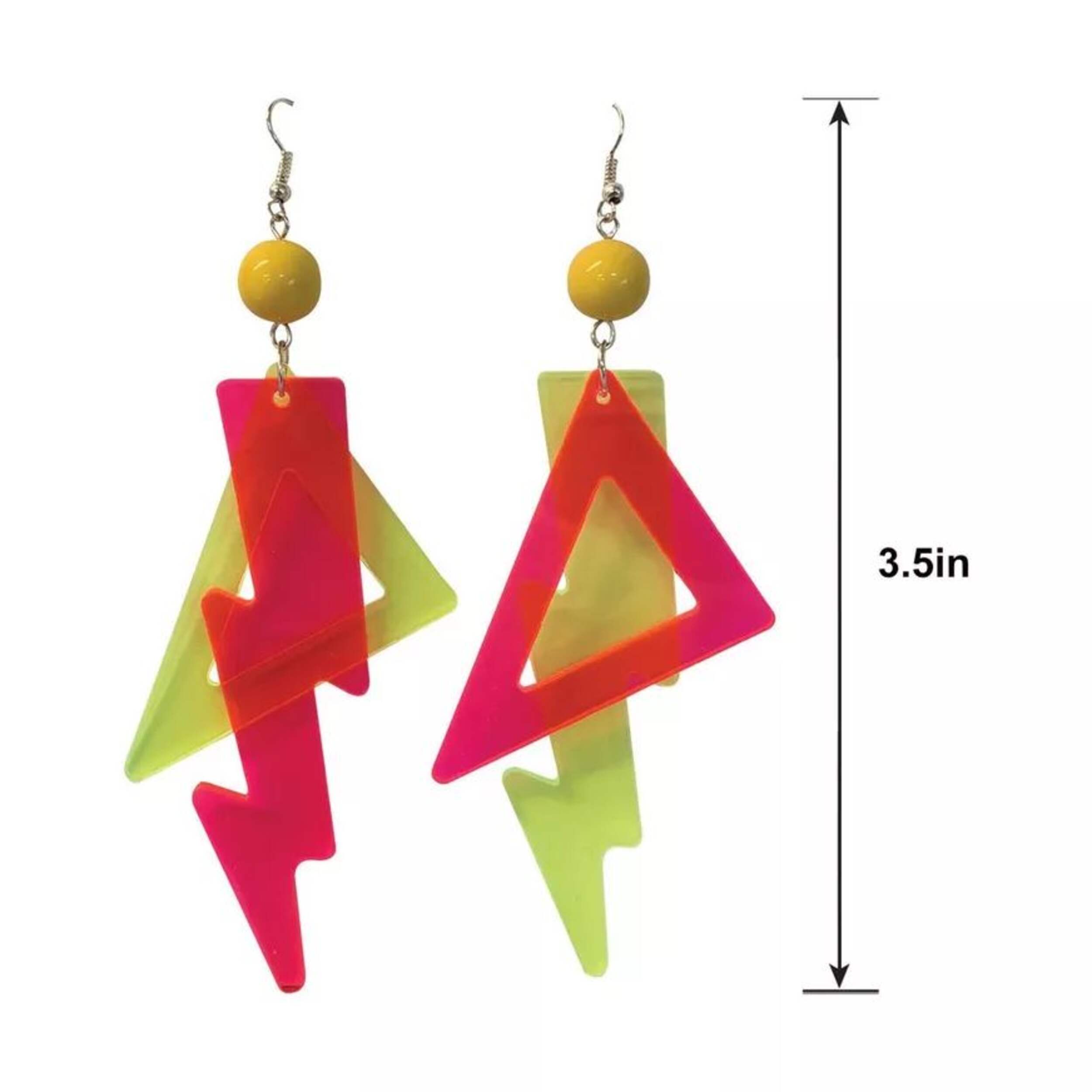 Get ready to embrace the rad vibes of the '80s with these neon Lightning Bolt Earrings! These tubular dangling earrings are crafted from metal and feature vibrant plastic designs of lightning bolts and triangles. They are the perfect accessory to complete your 80s-themed look, adding a pop of color and a dash of retro flair.