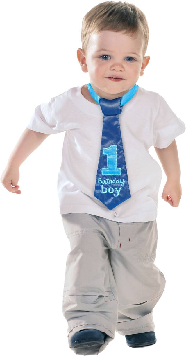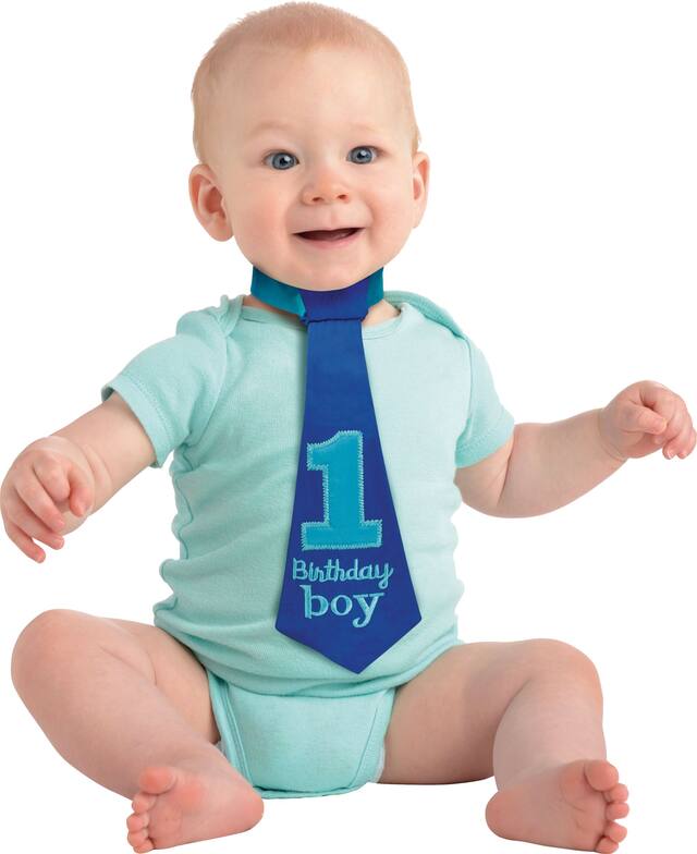 • Bright blue tie complements any birthday outfit and features a "1 Birthday Boy" headline