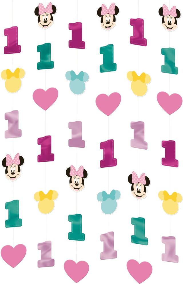 String decorations feature double-sided metallic number 1s and double-sided cardstock cut-outs that feature hearts mouse ears with bows and the face of Minnie Mouse