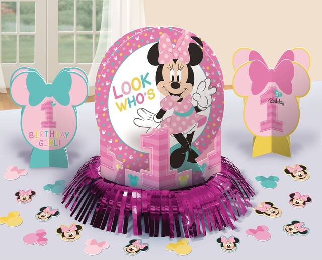 Largest centrepiece feature Minnie Mouse in a pink dress with a "Look Who's 1" headline surrounded by pink number 1s and metallic pink trim at the bottom