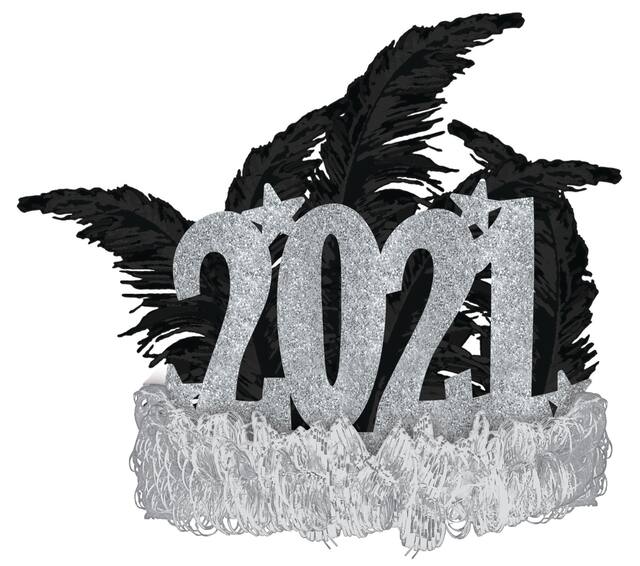 Shiny silver tiara features a starry 2021, large black feathers, and is perfect for ringing in the new year