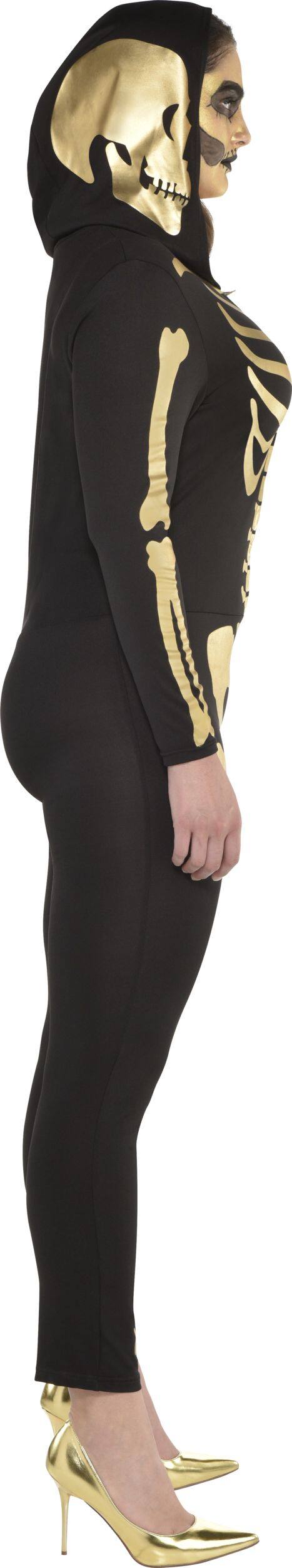 • 24 Carat Bones Women's Skeleton Costume features a plus size black hooded bodysuit with a metallic gold skeleton design