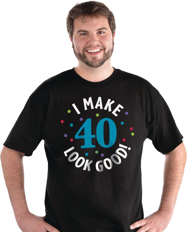 You may be interested in these similar products shown below.40th Birthday T-Shirt features a circular "I Make 40 Look Good!" headline and colourful polka dot pattern screen printed on the front