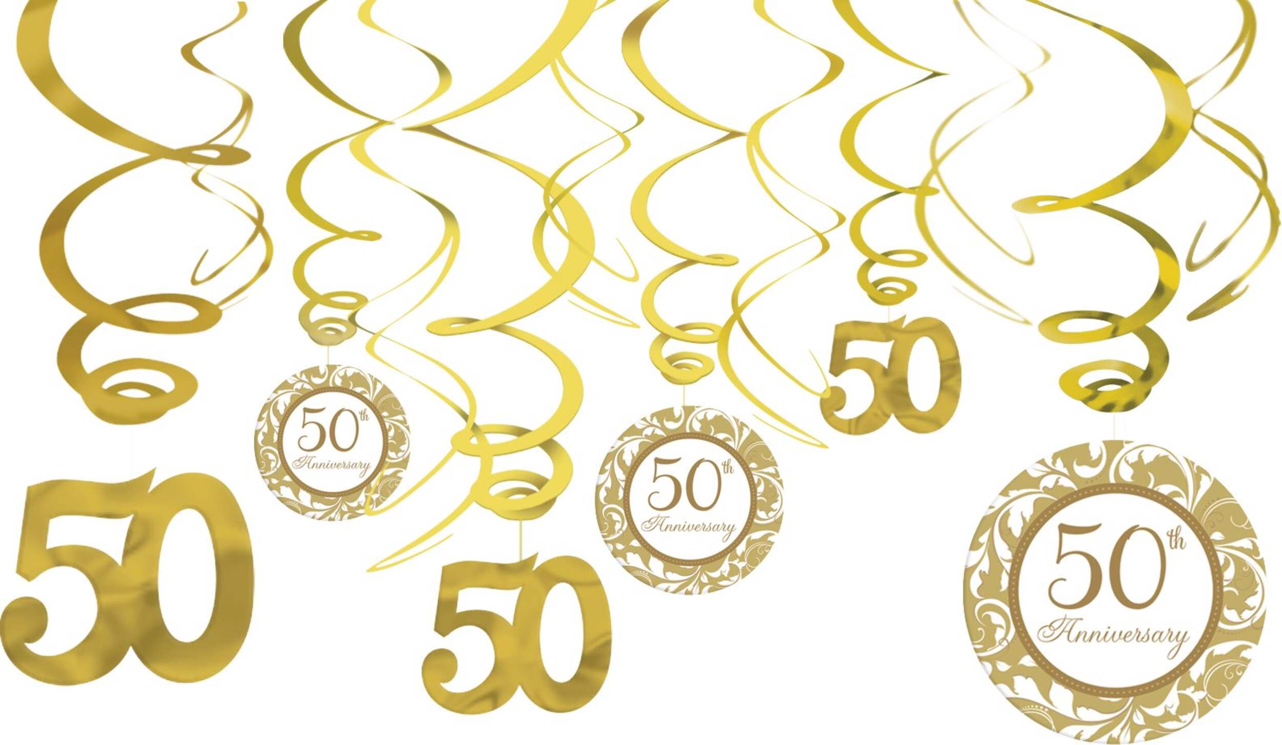 Metallic gold foil swirls come in eye-catching varieties such as plain, with a "50th Anniversary" cardstock circle, and with "50" hanging from the bottom