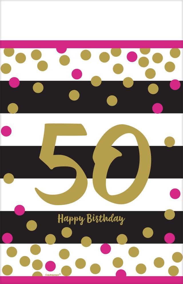 Celebrate your milestone birthday in style with a pink and gold table cover